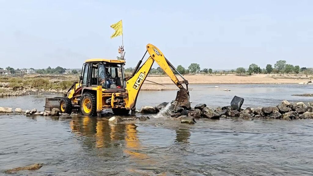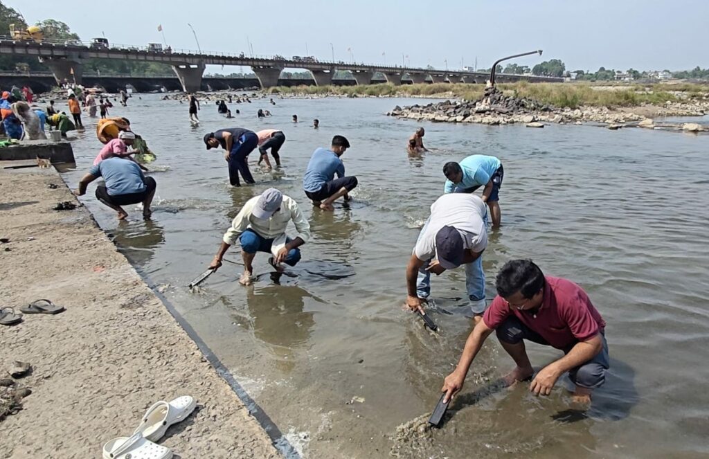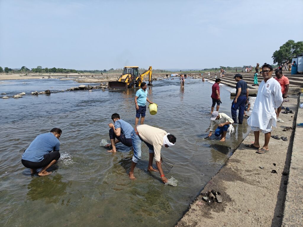 - नर्मदा नदी के रपटा घाट में काई हटाकर पत्थरों से बनाई मेढ़