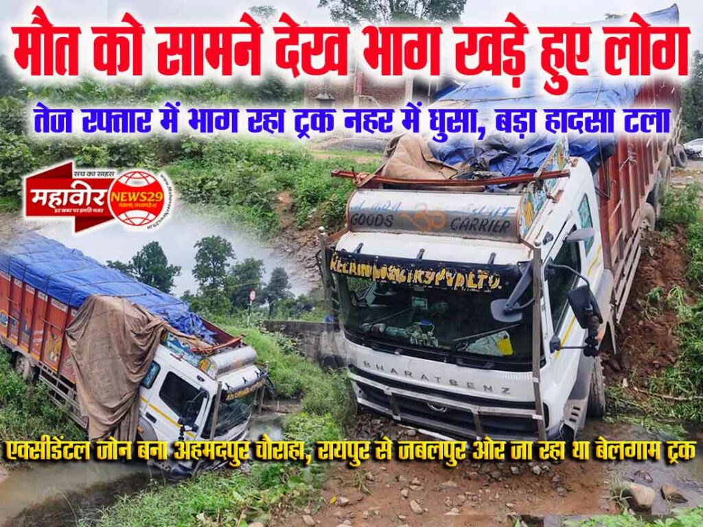 जानकारी अनुसार चौकी अंजनिया क्षेत्र अंतर्गत राष्ट्रीय राजमार्ग 30 में अहमदपुर चौराहा के पास एक्सीडेंटल जोन क्षेत्र है। यहां आए दिन सड़क हादसे की खबर सामने आती है। इसी क्षेत्र में एक बार फिर बड़ा हादसा होते-होते टल गया। बताया गया कि सोमवार की दोपहर करीब 12 बजे एक बेलगाम ट्रक रायपुर से जबलपुर की ओर जा रहा था, इसी दौरान अचानक घाट उतारते वक्त चालक ने ट्रक से नियंत्रण खो दिया और ट्रक नहर में जा घुसा, हालाकि इस हादसे में चालक और परिचालक ने ट्रक से कूद कर जान बचाई।