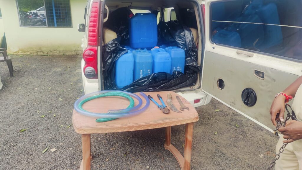 जानकारी के अनुसार 28 अगस्त की रात को सूचना प्राप्त हुई कि ग्राम उदयपुर में शिवा ढाबा के पास स्कार्पियो कार कमांक एचआर 29 एजी 8988 में बैठे अज्ञात तीन व्यक्तियों द्वारा डीजल चोरी कर बरेला तरफ भाग रहे हैं। सूचना पर थाना बीजाडांडी पुलिस ने तत्काल रवाना होकर शिवा ढाबा उदयपुर पहुंचे जहां से वाहन निकल चुका था। वाहन में तीन व्यक्तियों की सूचना मिली। वाहन व फरार ओरोपियों की तलाश पतासाजी के दौरान बरेला-रिछाई तिराहा से उक्त संदिग्ध वाहन में आरोपी सोहेल पिता लईक खान 37 वर्ष निवासी गणेश चौक मंडीदीप जिला रायसेन एवं आरोपी हिरेन्द्र उर्फे विक्की ठाकुर पिता अंतराम ठाकुर 27 साल निवासी ग्राम खम्हरिया थाना कानीवाडा जिला सिवनी को बरेला-रिछाई तिराहा निवास रोड पर हमराह स्टॉफ की मदद से घेराबंदी कर उक्त दो आरोपियों को रंगेहाथों पकड़ा गया और एक मुख्य आरोपी मौके से फरार हो गया।