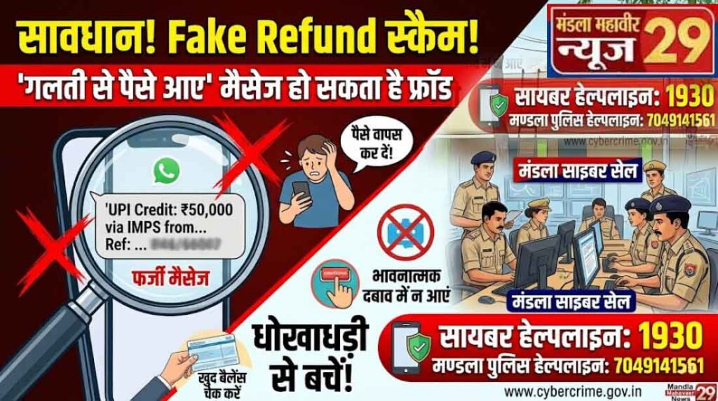 मंडला महावीर न्यूज 29. साइबर अपराधी आजकल आम नागरिकों को ठगने के लिए ‘फेक रिफंड स्कैम’ (Fake Refund Scam) का सहारा ले रहे हैं। मंडला पुलिस की साइबर सेल ने जिले के नागरिकों को आगाह किया है कि “गलती से आपके खाते में पैसे ट्रांसफर हो गए हैं” कहकर फोन करने वाले गिरोह से सावधान रहें। अपराधी फर्जी SMS या व्हाट्सएप स्क्रीनशॉट भेजकर लोगों को भ्रमित कर रहे हैं और भावनात्मक दबाव बनाकर उनके खुद के पैसे अपने खातों में ट्रांसफर करवा रहे हैं।