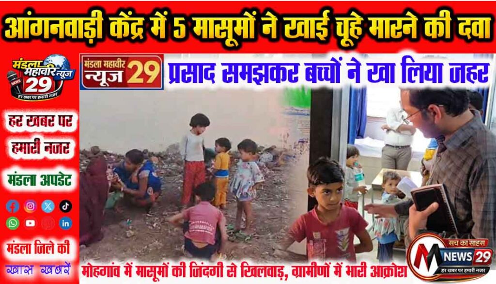 मंडला महावीर न्यूज 29. मंडला जिले में महिला एवं बाल विकास विभाग की घोर लापरवाही का एक सनसनीखेज मामला सामने आया है। मोहगांव विकासखंड के ग्राम रमखिरिया (छपरा टोला) स्थित आंगनवाड़ी केंद्र में 5 मासूम बच्चों ने खेल-खेल में चूहामार दवा खा ली। इस घटना ने विभाग के उन तमाम दावों की पोल खोल दी है जो बच्चों के पोषण और सुरक्षा के नाम पर कागजों में किए जाते हैं।