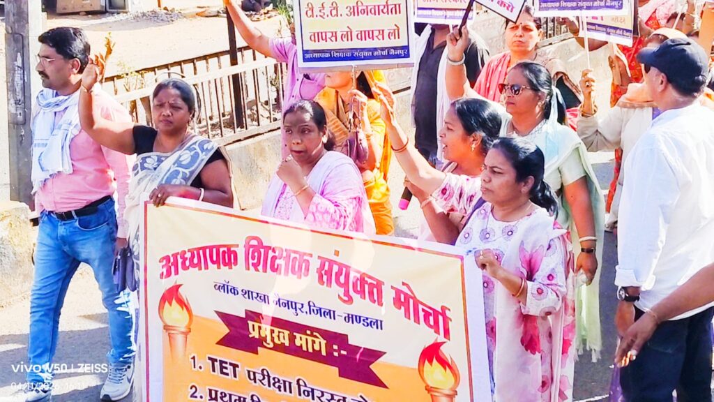 मंडला महावीर न्यूज 29. अध्यापक शिक्षक संयुक्त मोर्चा के आह्वान पर शनिवार को मंडला जिले के विभिन्न विकासखंडों में शिक्षकों ने ऐतिहासिक प्रदर्शन किया। नारायणगंज और बीजाडांडी ब्लॉक में 500 से अधिक शिक्षकों ने एकजुट होकर विशाल रैली निकाली और सरकार द्वारा अनिवार्य की गई शिक्षक पात्रता परीक्षा के विरोध में प्रशासन को ज्ञापन सौंपा।शिक्षकों का कहना है कि माननीय सर्वोच्च न्यायालय के हालिया निर्णय के बाद देशभर के लगभग 30 लाख और मध्यप्रदेश के 1.60 लाख शिक्षकों के भविष्य पर तलवार लटक गई है। बीजाडांडी में जिला संयोजक दिलीप मरावी और ब्लॉक संयोजक अरुण सूर्यवंशी ने संबोधित करते हुए कहा कि शिक्षकों की नियुक्ति तत्कालीन मापदंडों के आधार पर हुई थी। वर्षों की सेवा और सकारात्मक शैक्षणिक परिणामों के बाद, अब इस उम्र में प्रतिस्पर्धात्मक परीक्षा थोपना शिक्षकों के आत्मसम्मान के विरुद्ध है।