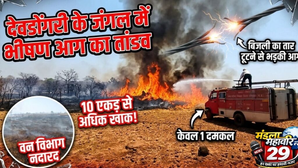 मंडला महावीर न्यूज 29. निवास-मंडला मार्ग पर स्थित ग्राम देवडोंगरी के समीप जंगल में भीषण आग लग गई। इस अग्नितांडव ने देखते ही देखते लगभग 10 एकड़ से ज्यादा वन क्षेत्र को अपनी चपेट में ले लिया, जिससे बेशकीमती वन संपदा को भारी नुकसान पहुँचा है।प्रत्यक्षदर्शियों ने बताया कि जंगल के ऊपर से गुजर रहा बिजली का तार अचानक टूटकर नीचे गिर गया। सूखी पत्तियों और सूखी घास ने तुरंत आग पकड़ ली, जिसने तेज हवाओं के चलते विकराल रूप धारण कर लिया। घटना की गंभीरता को देखते हुए निवास डायल 112 और दमकल वाहन तत्काल मौके पर पहुँचे।